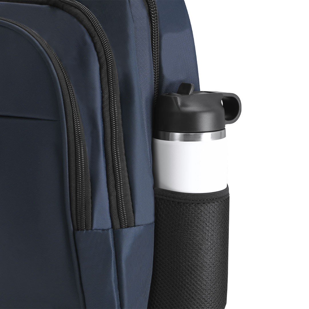 Mochila fabricada en resistente nylon 600D. De estilo actual, con 4 prácticos bolsillos exteriores de distintos tamaños, fáciles de abrir y cerrar, con cremalleras en color negro. Interior con compartimento acolchado para ordenador portátil de hasta 15 pulgadas, con dos compartimentos laterales de rejilla, elásticos y de fácil acceso. Cómoda de transportar gracias a sus asas acolchadas y su espalda con acolchado ergonómico.